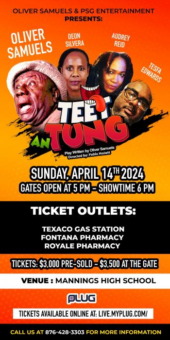 Manning's School, Savanna la Mar, JamaicaThe king of comedy Oliver Samuels and PSG Entertainment presents 'Teet an Tung' a original play written by Oliver Samuels and directed by Pablo Hoilett, presented at the Manning High School on Sunday April 14 at 5:30 PM. Tickets: $3000 pre-sold- $3500 at the gate.
