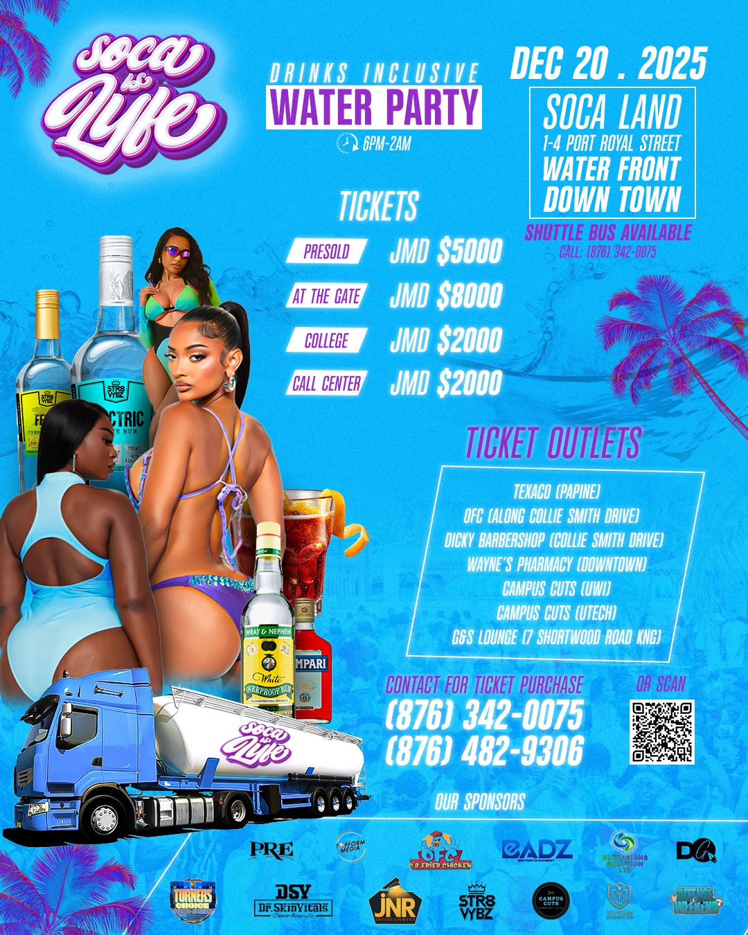 1-4 Port Royal Street, Kingston, JamaicaAre you ready for this staging of SOCA IS LIFE? DRINKS INCLUSIVE WATER EVENT DECEMBER 20, 2025 (SATURDAY) VENUE: SOCA LAND (Fisheries car park, 1-4 Port Royal Street) This staging is a water event, so prepare to get wet! #waterparty #soak #drinks #girls #watertruck #SocaIsLyfe